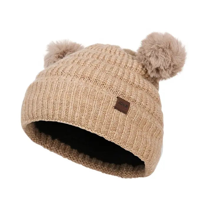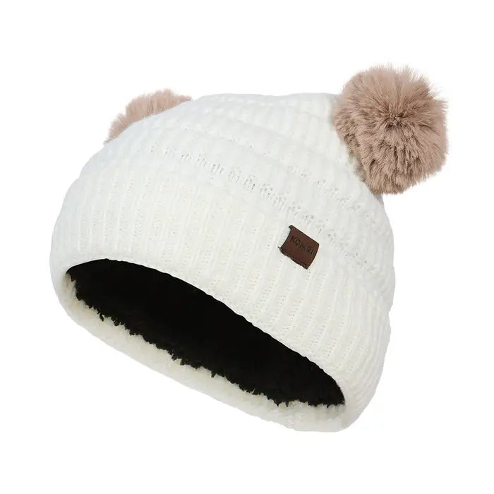 Get ready to bear the cold with this cute winter hat from Kombi! Featuring a unique striped-knit pattern and two adorable faux-fur pompoms that look like little bear ears, this Kombi toque is made with a blend of recycled polyester yarn and wool for more warmth, with a super-soft sherpa lining.