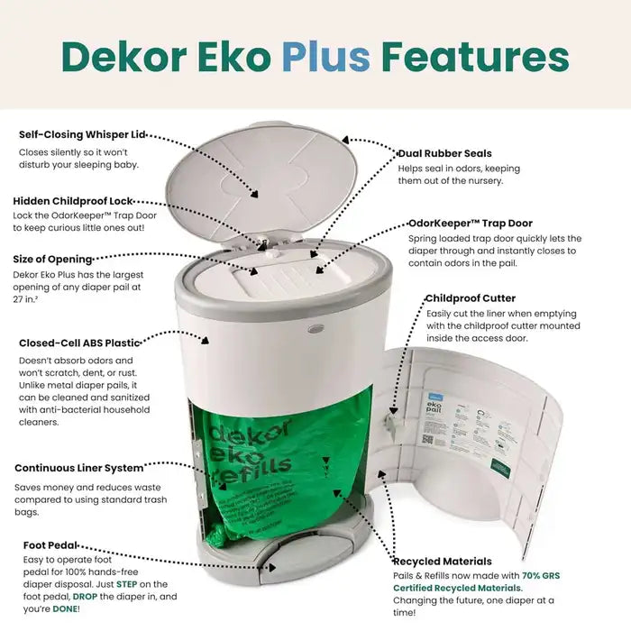- Commitment to Sustainability: Dekor Eko Diaper Pails can be reused as a trashcan after your diapering years are (finally!) behind you. Simply pop out the trap door insert and use it as a bathroom trashcan, or even for pet waste.