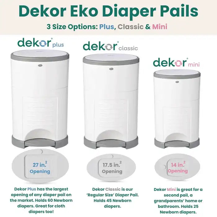 - Comes Assembled with FULL-SIZED EKO REFILL PRE-INSTALLED which holds up to 580 newborn diapers. Dekor Eko comes in three different sizes: Plus, Classic, and Mini - Only use genuine Dekor Eko PLUS Refills with Exclusive End-of-Liner Markings with this pail.