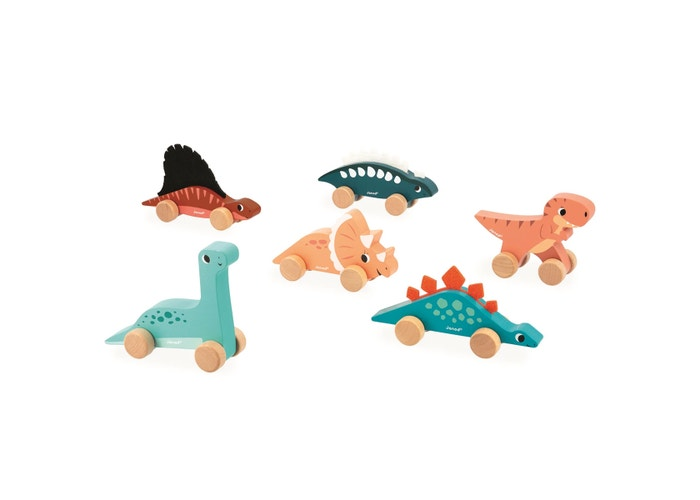 1 dinosaur, 2 dinosaurs, 3 dinosaurs… collect them all! Stegosaurus and Ankylosaurus with their impressive felt bone plates on their backs. The Triceratops with its large horns. The Diplodocus recognizable thanks to its large neck. The T-rex and its big protruding teeth. The Spinosaurus with a large felt veil on its back. All are waiting for you to go on an adventure. These push-along dinosaurs are perfect companions for hours of playtime with little ones.