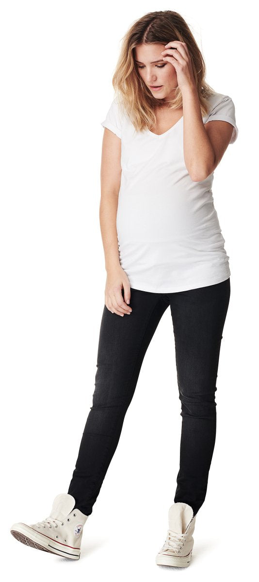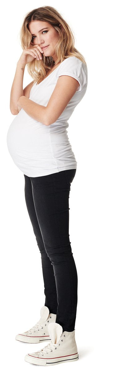 Upgrade your denim wardrobe with these skinny fit Avi jeans by Noppies. The jeans are from the essentials collection and come in a black wash. The denims effortlessly match other items in your wardrobe and come with stretch. This allows both your body optimum room to change and your baby to develop. Because of the carefully positioned belly band, which fits over your belly, the trousers keep their perfect fit. This band also provides you with extra confidence and support. The convenient extender strip on the inside of the band allows you to make it smaller with a button during the early stages of your pregnancy. There is no need to wash your denims after every wear to keep them looking good for longer, a simple airing is often enough. Wash the jeans at a maximum of 40° and hang the trousers out to dry naturally..
