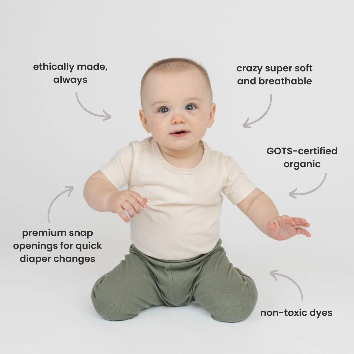 The perfect basic, 100% GOTS-certified organic cotton jersey short sleeve onesie with a classic finished neckline, perfect for drooling and spilling food on. You'll need one for every day of the week (trust us). Plus, it makes the perfect gift.