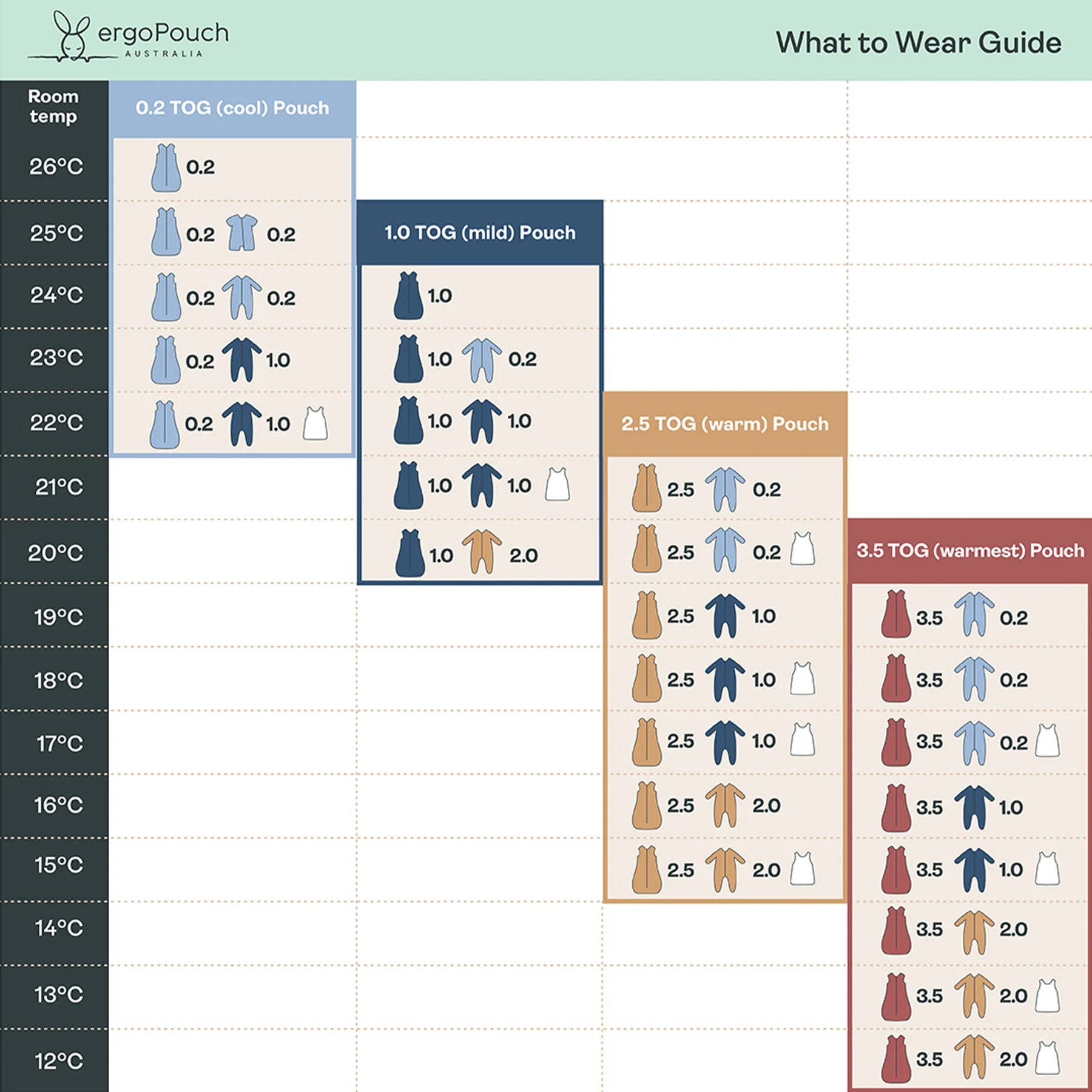 The 1.0TOG Cocoon Swaddle Bag is recommended for swaddled newborns and arms out (rollers) to age 12 months in room temperatures between 21°C and 24°C (68°F and 75°F).