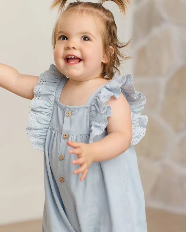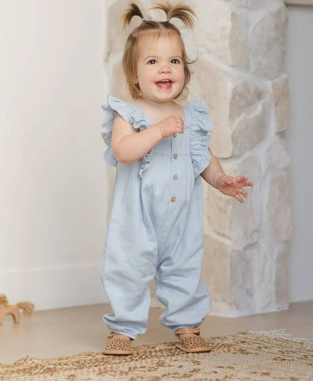 Sweet full length romper with front button placket and ruffle strap detail. Designed with bottom snaps for easy changes.