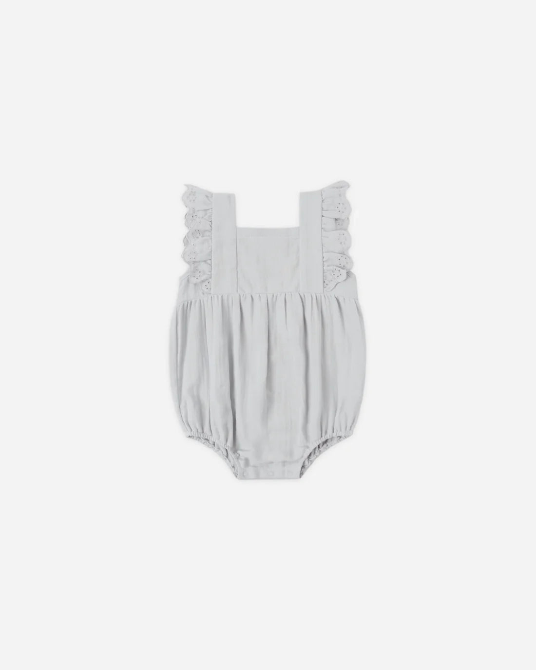 Ruffle scalloped sleeves with embroidered detail make the Naomi Romper a fancy fun look for spring. Designed with a keyhole back with button enclosure and bottom snaps for easy changing.