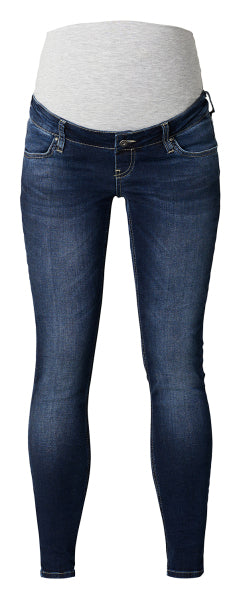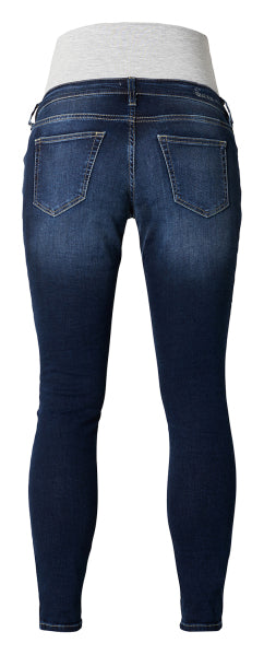These skinny fit maternity jeans by Queen mum come in a dark wash with lightly worn detailing. The adjustable waist and elastic belly band in a lighter colour allow you to wear these jeans in a 5-pocket style throughout your pregnancy and beyond.