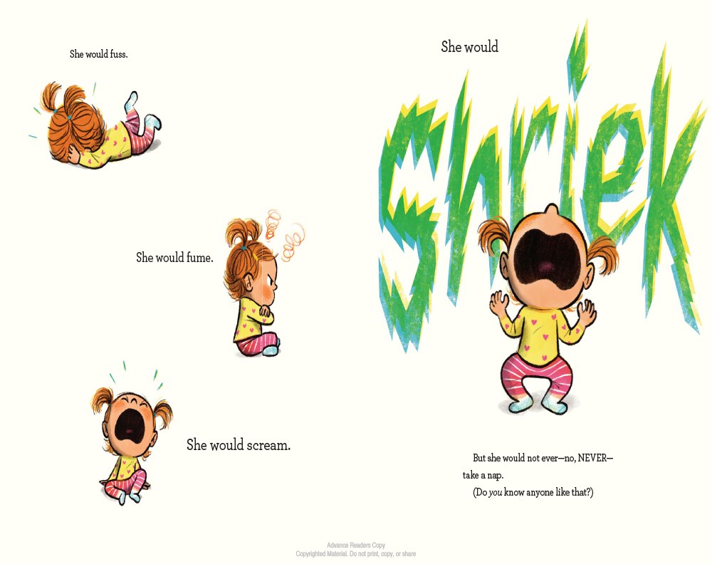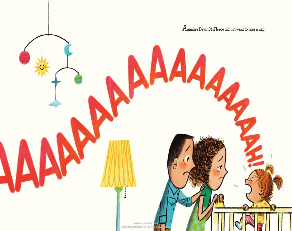 It’s time for a nap but, just like stubborn toddlers everywhere, Annalise Devin McFleece won’t have anything to do with bedtime. Dad tries to encourage sleepiness by pushing her around the park in her stroller. Along the way, they pass a man sitting on a bench, dog walkers walking dogs, a boy on a skateboard, kids playing ball, a girl practicing her juggling, and others. Each of them thinks that taking a nap is a great idea and if Annalise Devin McFleece doesn’t want hers, they’ll happy take it. And one by one, everyone falls asleep…except Annalise Devin McFleece. But when she’s finally ready for her nap, all the naps are taken! Is there anyone who has an extra nap to spare?